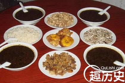 油茶佐以糕、糖、干果、葵花子,酒佐冷盘热炒,饭加蒸碗汤菜。坐席多为每桌10人(上下席各2人,左右席各3人),旧城、蟠溪、院溪一带每桌12人,县城每桌8人。