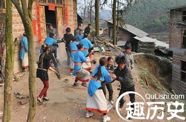 半路“抓亲” 此风俗流行于湘西苗族地区。姑娘结婚时,由六个年轻姑娘和一位40多岁的中年妇女组成送亲队伍。迎亲队伍由六个小伙子和两个姑娘组成。两支队伍都在清晨五更相向出发,相会后,迎亲队伍把挑来的糯米饭交给送亲的大嫂,大嫂把盛新娘用品的竹篮交给迎亲的姑娘,然后起把糯米饭给大家吃。