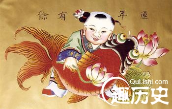 隋代后期,随着木刻书籍的产生,木版年画亦应运而生了。从绘画上讲,梁朝刘琰的《少年行乐图》可称之为年画之先声。到了唐五代,画目繁多,有韩滉的《丰稔图》、周昉的《游春仕女图》、《扑蝶图》、李嵩的《观灯图》、易庆之的《元宵图》、徐熙的《牡丹图》、苏汉臣的《婴儿对浴图》等。尤其是《婴儿对浴图》,画上画的婴儿赤身系红兜肚,戏舞花侧,着色鲜明,栩栩如生。这证明,唐代的年画在构图和用色上,均达到了相当水平。