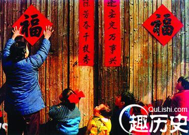 贴春联,春联的一个源头是桃符。最初人们以桃木刻人形挂在门旁以避邪,后来画门神像于桃木上,再简化为在桃木板上题写门神名字。
