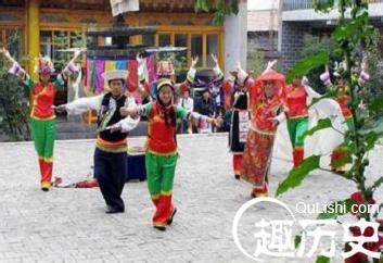 土语称“安召”。凡喜庆佳节或婚礼宴席中,人们围成圆圈,旋转歌舞,曲调具有独特的民族风格,节奏多为3拍子。领唱的乐句简短,合唱的乐句较长,往往带有延长音的衬句。