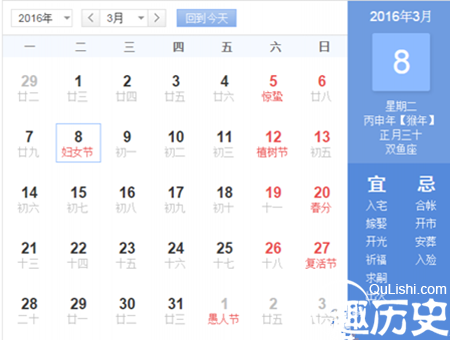 据万年历可知,2016年三八妇女节是正月三十,星期二。