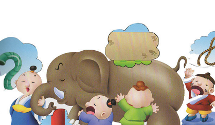 很久以前,有一位国王命令手下官吏:“你们到全国各地去,寻找一些天生的瞎子,把他们都带到王宫来。”官吏们接到命令就出发了,将国内所有的瞎子都带到王宫里,并向国王报告:“我们已找到很多瞎子,现在都站在大殿下面。”国王说:“把他们带出去,将大象指给他们。”