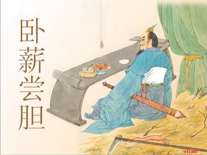 勾践在坐卧的地方吊了个苦胆,夜里躺在柴草上,面对苦胆。每天吃饭时都尝尝苦胆。总扪心自责:"你忘了会稽大败之辱吗?"就这样勾践跟同甘共苦共同命运,经过十年发展生产,积聚力量,又经过十年练兵,终于在公元前473年打败夫差,灭掉了吴国。