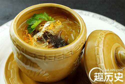 佛跳墙这道菜,相传源于清道光年间,距今有两百多年历史。此菜以十八种主料、十多种辅料互为融合。其原料有鸡鸭、猪肚、蹄尖、蹄筋、火腿、鸡鸭肫;有鱼翅、海参、鲍鱼(鲍鱼食品)、干贝、鱼高肚;也有鸽蛋、香菇(香菇食品)、笋尖、竹蛏等共三十多种原料与辅料分别加工调制而成。