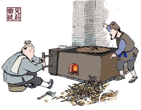 突:烟囱;徙:搬移。“曲突徙薪”是说将烟囱改建成弯曲的,把柴草搬远点,意思是防患于未然。“焦头烂额”原意为被火烧伤的样子,现比喻狼狈不堪。
