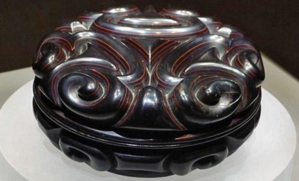 盘木胎黑漆,内外均雕云纹,堆漆甚厚,晶莹照人,刻工圆润,在黝黑峻深的刀口断面露出朱漆四道,是《髹饰录》中所谓“乌间朱线”的作法。