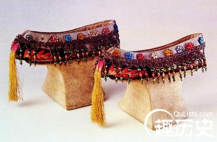 清代爱美的满族妇女除了在“高底鞋”鞋帮上饰以蝉蝶等刺绣纹样或装饰片外,木跟不着地的部分也用刺绣或串珠加以装饰,有的鞋尖处还饰有丝线编成的穗子,长可及地,分外别致。