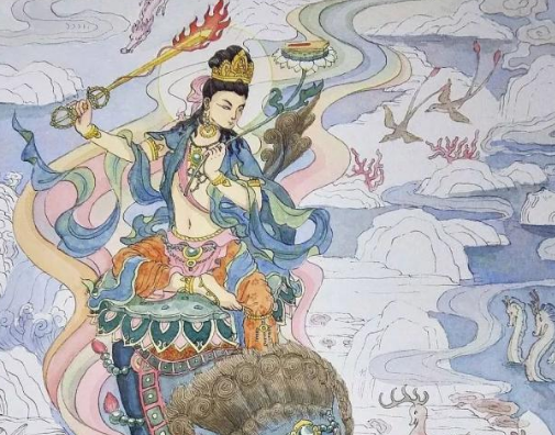 在大乘佛教的典籍中,文殊是与释迦牟尼同时代的人。他生于古印度舍卫国,系多罗聚落婆罗门种姓;父亲名叫梵德,是一位著名的大长者。据说文殊一出生就会说话,像童天子一般;和释迦牟尼一样,也有三十二相、八十种好,显示出他的不同凡响。