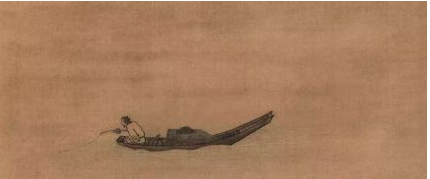 画面四周皆不着墨迹,只是在船边勾出淡淡的几条水波纹以示江面,使人可以联想江的空旷,人在画面中央,更突现出一个“独”字。