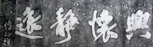 2、《右军大醉诗轴》:是傅山的代表作,诗云:“右军大醉舞蒸豪,颠倒青蓠白锦袍。满眼师宜欺老辈,遥遥何 处落鸿毛。”其流畅的用笔中仿佛有着某种生拙的气息,然而其用笔又在法度之中。缠绕游丝的强调,使字与字,笔划与笔划间的疏密空间对比格外鲜明。其间欹斜反正、相避揖让、纵敛开合等艺术手法,在傅山的手下运用得十分娴熟,仿佛均在不经意中,真率的情感、大起大落的章法,充分表现了他博大精深的胸怀。