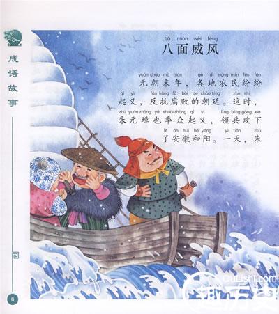 船主是一对老夫妻,船夫知道船上坐着的是大名鼎鼎的朱元璋,便高声喊着号子向他庆贺说:“圣天子六龙护驾,大将军八面成风。”朱元璋明白这是祝贺帝王的话,心里非常高兴,便和徐达轻轻地踢着脚,互相表达庆贺之意。后来朱元璋统一全国,建立了明朝,他成为历史上闻名的皇帝明大祖。明太祖找到当年的船夫,给了他封赏,又将他那只小船涂上朱红颜色,表示有功。