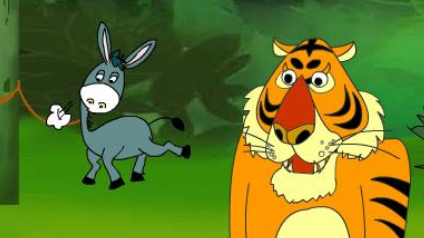 老虎远远地躲在树林里,偷偷地观察毛驴的一举一动。过了一段时间,老虎放轻脚步小心翼翼地朝毛驴的方向挪动了几步,想弄清楚这个怪物究竟是什么东西。它一点一点地靠近毛驴,可还没等老虎看清,毛驴突然大叫起来,声音大得响彻了山谷,回音不绝。毛驴的叫声着实把老虎吓了一大跳,以为它要来吃自己了,吓得急忙逃得远远的。