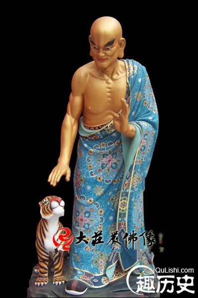 第十八位,弥勒尊者,为伏虎罗汉。伏虎罗汉,因为在寺庙外经常遇到有一只饥饿的老虎,他把他的斋饭分给这只老虎吃,所以就叫伏虎罗汉。