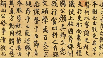颜真卿的真书雄秀端庄,结字由初唐的瘦长变为方形,方中见圆,具有向心力。用笔浑厚强劲,善用中锋笔法,饶有筋骨,亦有锋芒,一般横画略细,竖画、点、撇与捺略粗。这一书风,大气磅礴,多力筋骨,具有盛唐的气象。