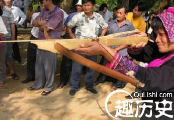 弩在我国古代是一种重要的狩猎工具。最原始的弩是木制的,或是木和骨角合制。它身长40厘米,弩弓弯35厘米,弩柄是用较好的木材制成,宽6厘米,厚1.5厘米,弩箭是用小竹制成,长度约30~35厘米,头部用三角小铁片制作,比较锋利,构造较为简单。弩在过去是黎族同胞用于射老鼠、河鱼、蛇、青蛙的一种器械,以后射弩逐渐演变成传统体育活动。在农闲或喜庆日子,射弩是一项必不可少的体育项目。比赛时,射手使用自制的弩,在一定的距离(15米或20米)瞄准目标,目标是用一张正方形的白纸,中间用黑色或其他颜色画成l0厘米的小圆圈,按规定借助依托,进行立射、跪射,每人只射3~5次,中箭多者胜。对于优胜者给予猪脚、鸡或其他食品奖励。在20世纪80年代,射弩这一古代的民族习俗,已被国家体委定为民族传统体育运动会的竞赛项目。