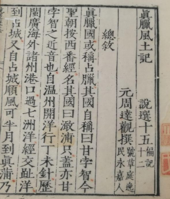 周达观写有一本游记——《真腊风土记》,说他在三十岁那年,即元成宗元贞元年(1295年),曾随朝廷使团乘船到过一个名叫真腊的国家。鉴于真腊的风土情物与中土迥然不同,他写了一本《真腊风土记》,详细叙述了真腊的山川、物产,以及居民的生活、经济、文化习俗、语言等。