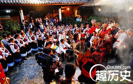 基诺族 春节到来,聚居于云南西双版纳的基诺族,口嚼槟榔的老翁扬头打钹,戴大尖帽的老妪低首鸣锣,由周巴(寨父)最先把鼓敲响,男女青年围成一圈徒手跳舞。