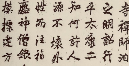 此碑用笔瘦劲,方圆兼备,字体略呈斜势,而不失庄严,奇险中更见其稳健。这种豪爽雄健之气是东晋二王以来的行书所没有表现出来的。