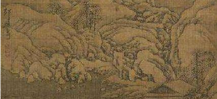 写崇山峻岭山坳问,寺院深藏,山脚下水竹村居,溪回路曲,板桥横跨。用笔粗犷苍劲,但有清淡超逸之致。