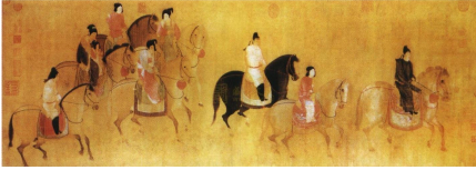 此图描绘的是天宝十一年(752年),再现唐玄宗的宠妃杨玉环的三姊虢国夫人及其眷从盛装出游,“道路为(之)耻骇”的典型环境。