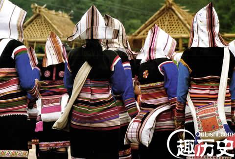 基诺族就用这种“砍刀布”装扮着自己。男子通常穿无领无扣的对襟黑白花格上衣,前襟和胸部有几根红、蓝色花条,背部绣有约20厘米见方的太阳花式图案,下穿宽大的长管裤或短裤;妇女胸穿鸡心式的绣花胸兜,外穿蓝、红、黄、白花格无领对襟上衣。下穿红布镶边的短裙,裹蓝色或黑色的绑腿。头戴长及肩部的披风式尖顶帽。这种帽子别具一格,形似现代都市风雨衣上的尖顶帽,是基诺族妇女服饰的一个显着特征。它是用长约60厘米、宽约23厘米的竖线花纹砍刀布对折,缝住一边而成。戴时常在帽沿上折起指许宽的一道边。身材苗条的基诺族妇女穿戴上这样一套色彩协调、剪裁适体的服装,显得既庄重大方,又活泼俏丽。