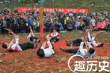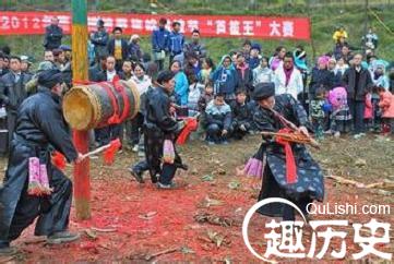 特别是未婚的青年男女,更是把自已打扮得大方得体,决意在场上展露风韵而选中如意的心上人。尤其是小伙子更是跃跃欲试,因为,他们除了在坡场上展露头角外,还有一关过硬的竞技决斗,那就是爬杆与跳高难度的芦笙舞。爬坡杆是节日的中心内容,青年们围着坡场中竖起的一根高约10米的坡杆,随着笙歌翩翩起舞,为比赛助威喝彩。参赛者则一一展示其强健的体魄和过人的爬杆技巧,那些动作优美、在杆顶畅饮美酒、摘取红腰带和腊肉的小伙子是坡场上的英雄,赢得比赛的同时也赢得姑娘的芳心。