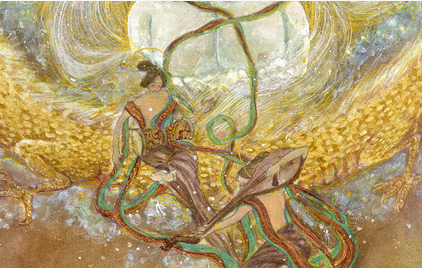 在“成礼”的鼓声中,读者仿佛看到《东皇太一》中“扬枹兮拊鼓”、《东君》中“縆瑟兮交鼓”、《国殇》中“援玉枹兮击鸣鼓”诸种或庄肃或雍容或悲壮的场面。而面对令人眼花缭乱的传花轮舞,读者无疑又会联想起《东皇太一》中“灵偃蹇兮姣服,芳菲菲兮满堂”、《云中君》中“灵连蜷兮既留,烂昭昭兮未央”、《东君》中“翾飞兮翠曾,展诗兮会舞”那流芬溢彩的神巫之舞。