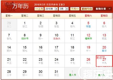 复活节日期是不固定的,通常是要查看日历才能知道。2016年复活节是3月27日,星期日。